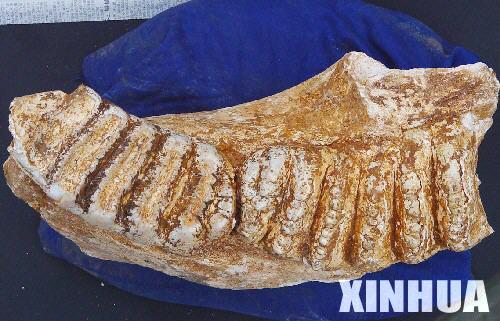 这是湖北省文物考古研究所发掘出土的乳齿象左下颌骨化石(2005年11月10日摄)。近日,湖北省文物考古研究所宣布,在湖北省利川市发现古动物化石群,共出土650件化石标本。据初步推断,其年代为200万年前。专家称,这是湖北省迄今发现的历史最悠久的古动物化石群。 新华社发(陆成秋摄)
