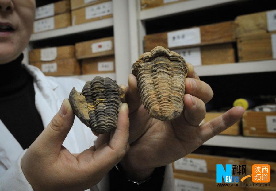 12月9日,在位于陕西省西安市的西北大学,刘建妮介绍两块珍贵的三叶虫化石。