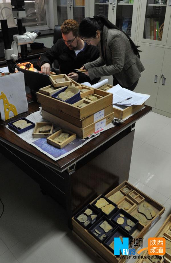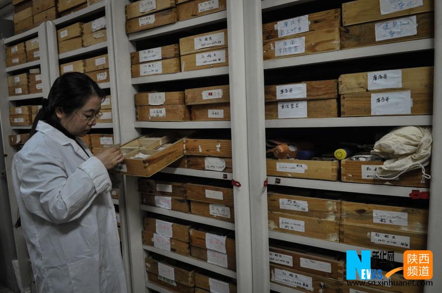 12月9日,在位于陕西省西安市的西北大学办公室内,刘建妮在整理化石。