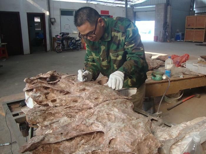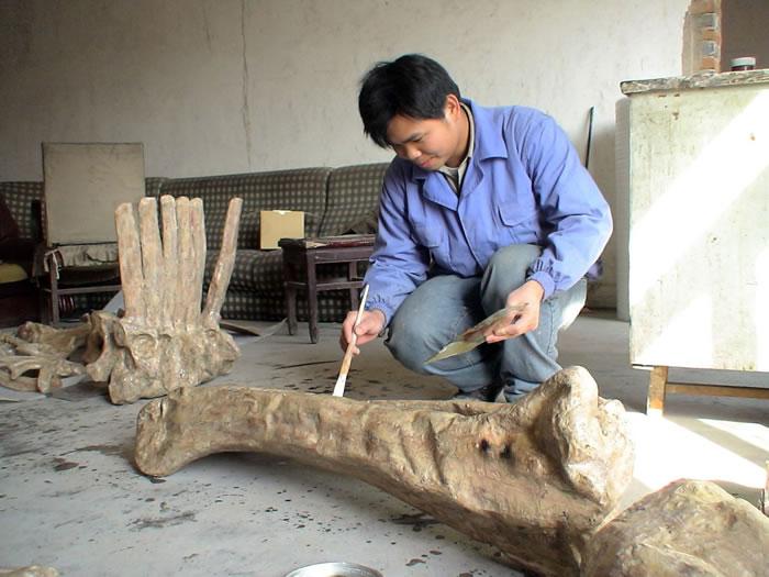 一开始,我生怕自己学不会技术,几乎每天拿着一个老式相机跟随师傅每做一步就拍一张照,我天天和那几位师傅们同吃同住一起工作,一天下来觉得还是蛮累的。学习期间中国科学院古脊椎动物与古人类研究所的王海军老师还邀我一同到宁夏灵武恐龙化石遗址,在二号坑里我们挖取一个恐龙头骨运回北京实验室修复研究。我还有机会到江苏常州中华恐龙园翻模一条巨型山东鸭嘴龙。