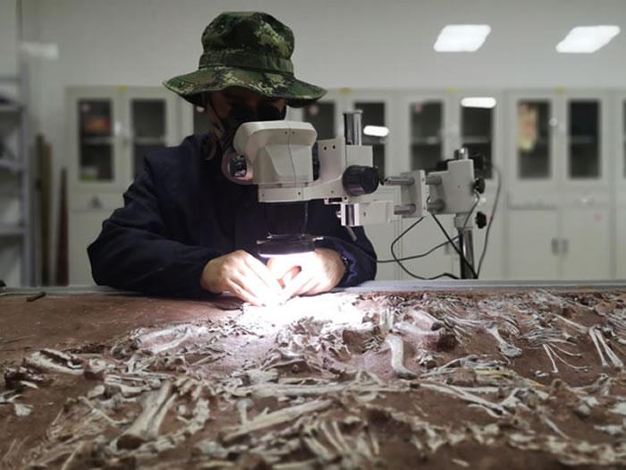 “王氏鳄化石仅有1.5米长,从头部到尾椎细小、精巧,部分腹肋只有几毫米,有些区域甚至还叠覆在一起,显微镜下也极难分清。必须全神贯注,心无旁骛,才能避免误伤化石。”