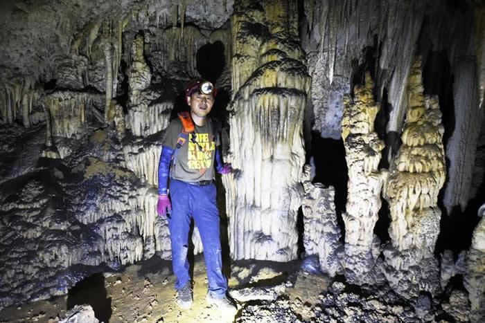 3月29日,记者和李益朝一同前往汉中市南郑区小南海镇天坑集中分布区,在深一脚浅一脚地走过大约一千米的河道后,来到天心洞的洞口。往里走,洞道里宽窄不一,水从高处石面上渗出,让人感到阴冷潮湿。抬头望去,光线从数十米高的天窗照进洞里,人站在下面,犹如站在大自然形成的漏斗里一般。李益朝告诉记者,仅仅这个小洞,他就来过十几次。大自然的鬼斧神工,使得天坑口有椭圆的,也有扁的,形状并不规整。洞道里也是形态各异,景色各有不同。这里地下洞穴的温度往往稳定在9℃到12℃,与当地年平均温度相当。项目组忙起来的时候,有时需要在伸手不见五指的洞道里,带着仪器、手电和干粮,生活两三天。