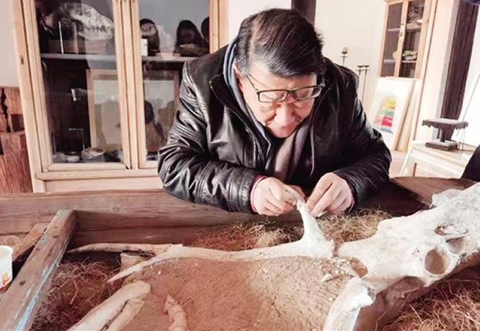 王仁斌学的是建筑设计,对雕塑也比较擅长,本着对化石的热爱,他在自己工作室里专门辟出区域做化石修复。