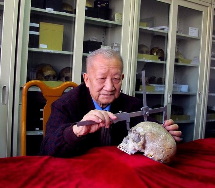 2012年11月,吴新智院士在观察柳江人头骨。刘武供图