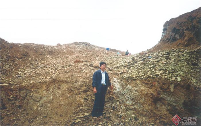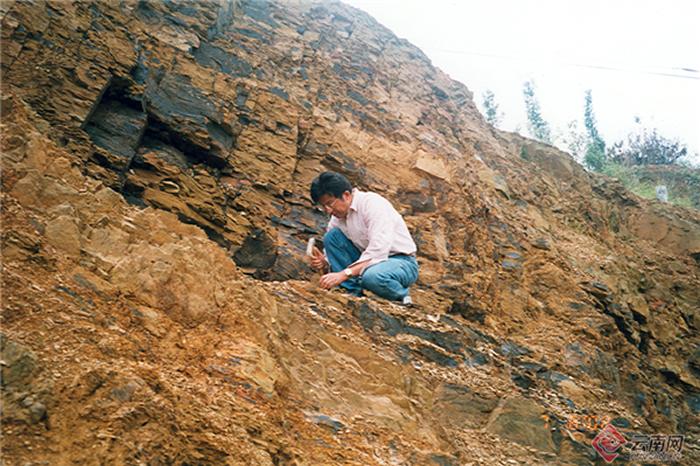 侯先光在澄江帽天山剖面的工作照