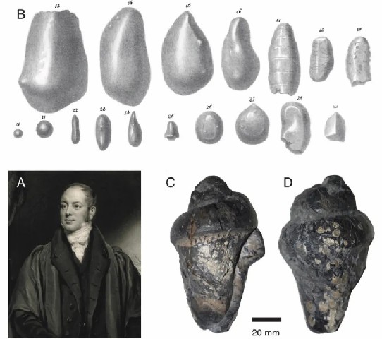 (A)威廉·巴克兰;(B)他于1835年的绘画,可见螺旋状粪化石;(C)他收集的粪化石。图片来源:参考文献[3]