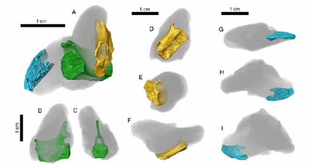 鲨鱼粪化石内部的三块骨骼,蓝色为鱼类头骨,绿色和黄色为海洋爬行的尾椎。图片来源:参考文献[3]