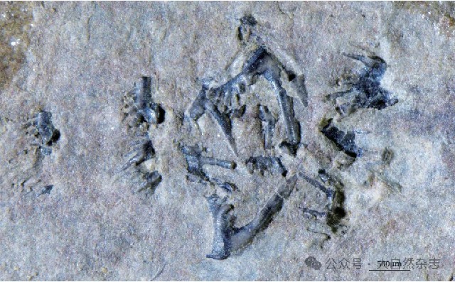 相比较于保存条件极为苛刻的软体动物化石,另一类标本成为我们解开牙形动物未解之谜的“钥匙”——牙形石自然群集标本。极少数情况下,牙形动物口咽部位的硬体器官可以部分或完整地保存在一起,呈对称结构,有规律地排列在岩层中,我们称之为“牙形石多分子器官”,其中的单个牙形石就是牙形分子,保存了这种器官的化石即自然群集标本。而一些经酸处理后,因成岩作用黏结在一起、保存了部分或完整的牙形石多分子器官的可称为“齿串”。
