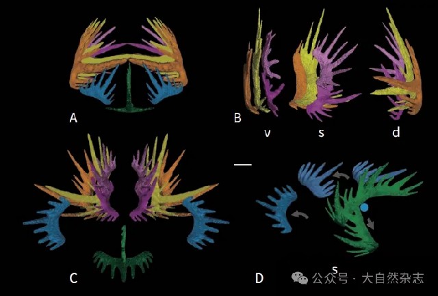 除直观重现多分子构成外,牙形动物口咽器官的空间结构也通过不同的标本得以还原。以司克泰舟石属和小厚颚石属的研究结果为依据,结合前人报道的奥泽克亚目和锯片石亚目系列运动学进行分析,我们首次基于化石证据确定了闭合状态下牙形动物口咽器官中不同类型牙形石的位置及方向,推测外侧的M分子和中间的S0分子从口部向腹方做往复运动,起到主动捕食的作用;而向内包裹的指掌状分子S1和S2通过口咽器官,沿头尾轴向上做相向运动,起到输送食物的作用。如此微小的生物个体竟然拥有这么复杂、精妙的进食结构,实在令人赞叹。
