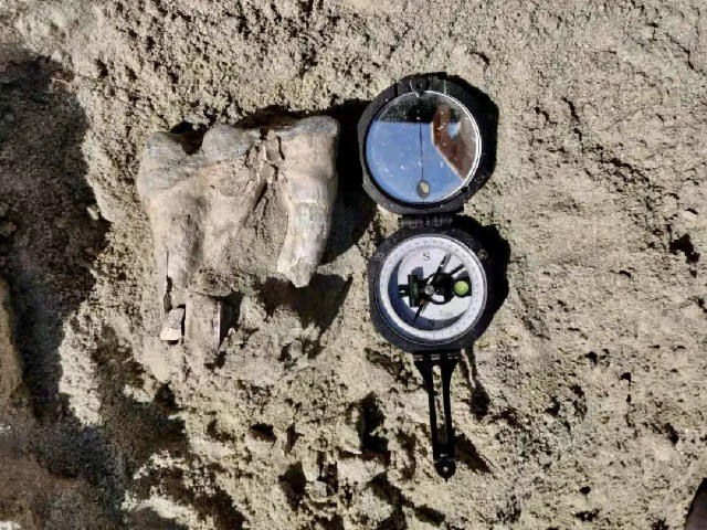准噶尔盆地发现的象类臼齿(罗盘作为参照比例尺) 供图/邢路达