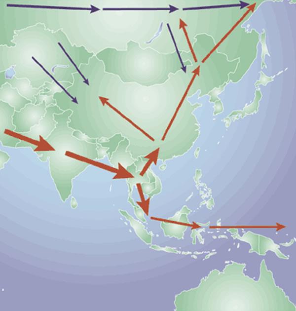 资料图片:非洲血统的东亚人的假定的迁徙路线(化石网配图)