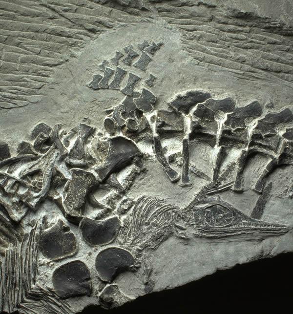 这个独特的物种发现于中国安徽的一个采石场里,你可以清晰的看到婴儿的出生——婴儿鱼龙的头刚从母亲的骨盆里伸出来。这次分娩至少还有另外两个后代出生:一个仍在母亲体内,另一个已经在母亲身边。