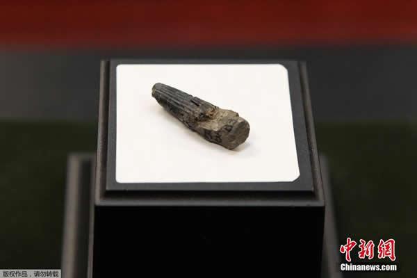 这块长二点三公分,宽一公分的恐龙化石是棘龙科恐龙的牙齿。这种恐龙有类似现代长吻鳄的颌部和牙齿,以鱼类为主食。