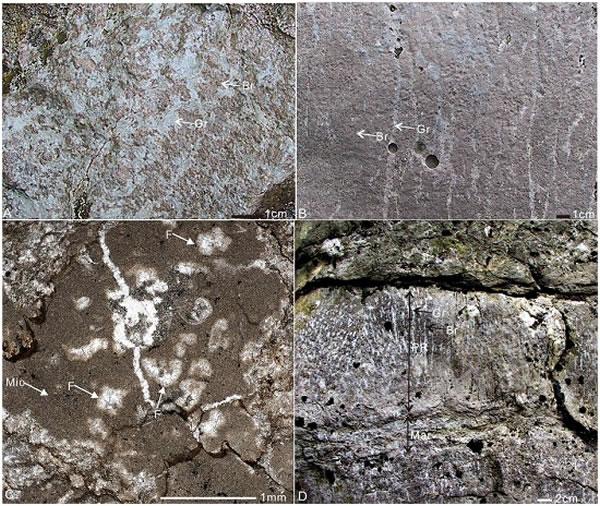 地质地球所油气资源研究室吴亚生副研究员等人曾对重庆北碚、江西修水等4个剖面的微生物岩进行细致观察,确定微生物岩不只是呈树枝状,还呈斑点状、网状等构造(图1)。他们通过古生物学、沉积学与成岩作用综合研究,确定是某种菌落化石以及成岩作用共同控制了这几种特殊微生物岩构造的形成。在菌落化石密集的地方有许多生物体降解消失之后留下的孔洞,成岩流体在这些孔洞中形成粗的方解石胶结物。粗晶体的方解石吸收更多的光线,因而在露头上呈暗色。化石稀少的地方,形成斑点状构造;化石密集的地方,形成树枝状和网状构造。这一认识2007年曾经发表在《岩石学报》上。