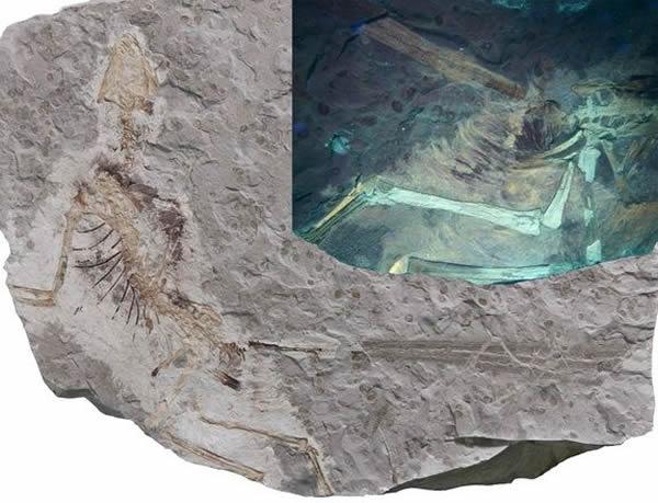 图中显示了在内蒙古发现的有羽毛的侏罗纪恐龙Epidexipteryx,在紫外光下显示了它额外的羽毛和软组织。