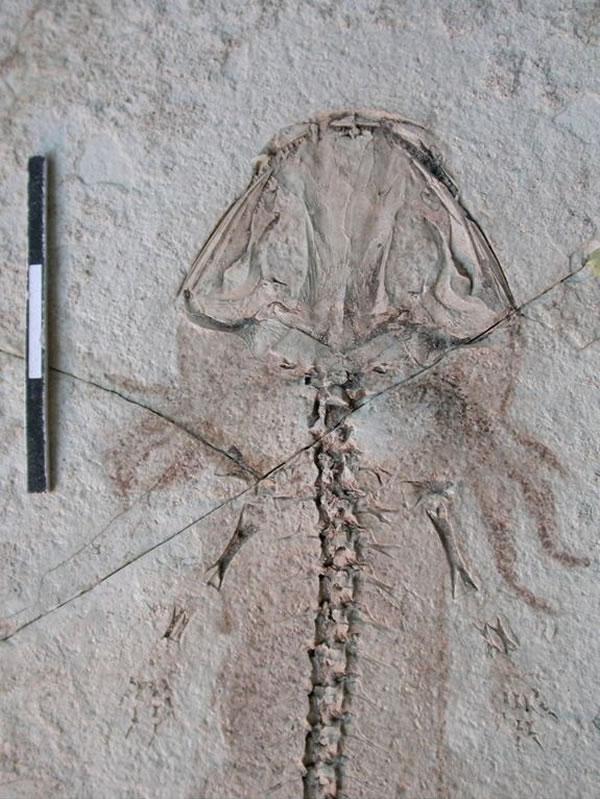 在道虎沟生物群发现的这个蝾螈Chunerpeton化石不仅显示了被完好保存的骨骼,还展示了皮肤甚至是外鳃。