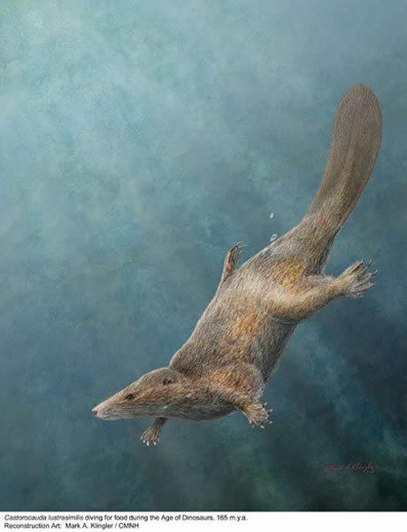 獭形狸尾兽(Castorocauda),一种会利用类似海狸的尾巴游泳的侏罗纪时期哺乳动物,图中显示了它保存有“类似鱼鳞”的皮肤。