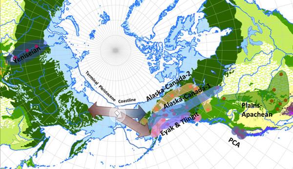 北美纳—德内语系与西伯利亚中部的叶尼塞语系拥有共同的语言元素,因此有学者提出了一个语言关系——德内—叶尼塞语门,它支持了早在哥伦布抵达美洲大陆前就已经有亚洲和美洲跨海洋接触的推断。此次研究人员对该语门中约40种语言的演化关系进行了数据模型分析,从中梳理出了语言的家族关系。研究人员推断,人类可能最先通过白令陆桥抵达北美,然后从北美海岸地区向内陆发展,而在这一过程中也出现了一部分移民反向迁移的迹象,这些早期人类穿过西伯利亚前往亚洲中部地区。