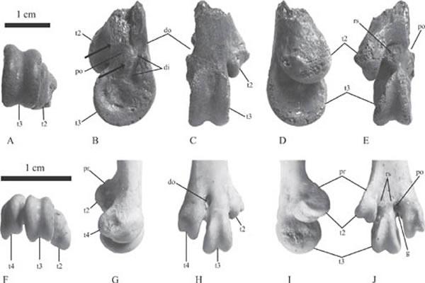 罗曼维尔雁鸭亚科鸟类的跗跖骨片段和现生大雁(Anser fabalis)跗跖骨对比图。(倪喜军供图)