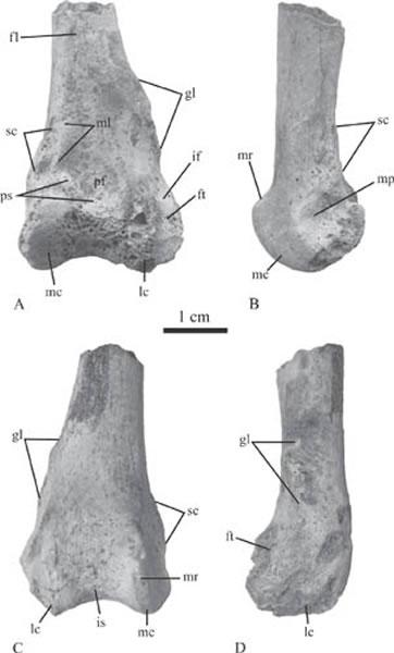 研究人员对新疆北部吉木乃晚始新世地层中新发现的两件鸟类化石进行了详细的对比研究,发现其中一件为鸟类跗跖骨片段,该标本保存了多个雁形目鸭科鸟类的特征,同时保存了水禽中仅见于罗曼维尔雁鸭亚科鸟类的特征组合。该跗跖骨属于一个个体很大的鸟类,与现生天鹅相当,其第二滑车内侧不存在突缘,第三滑车足底面的近中侧不对称,这些特征表明这件标本属于一个新属种。另一件标本为鸟类的股骨片段,属于一个与上面跗跖骨标本个体同样大小的鸟类,该标本的特征与在比利时发现的早渐新世可能属于鸭科罗曼维尔雁鸭亚科的Cygnopterus affinis相一致。