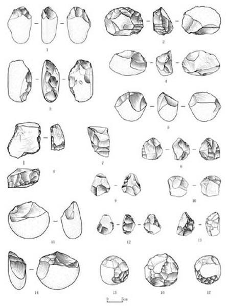 (a) 蓝田新发现的石制品。1. 手镐(斧?,LTP03:06);2-4,7,10. 刮削器(LTP02:537,LTP01:108,LTP02:534,LTP02:544,LTP02:543);5,11,14. 砍砸器(LTP02:526,LTP05:20,LTP02:488);6. 石核(LTP01:037);8,9. 手斧(LTP02:549,LTP02:518);12,13. 尖状器(LTP02:504,LTP02:510);15-17. 石球(LTP02:524,LTP02:489,LTP01:103)(王社江供图)
