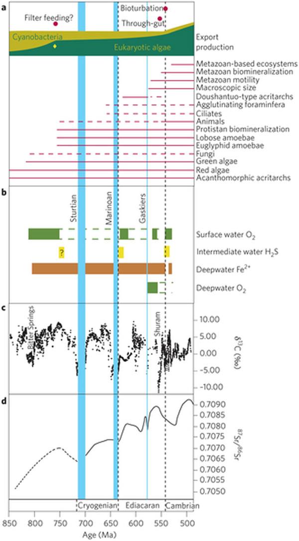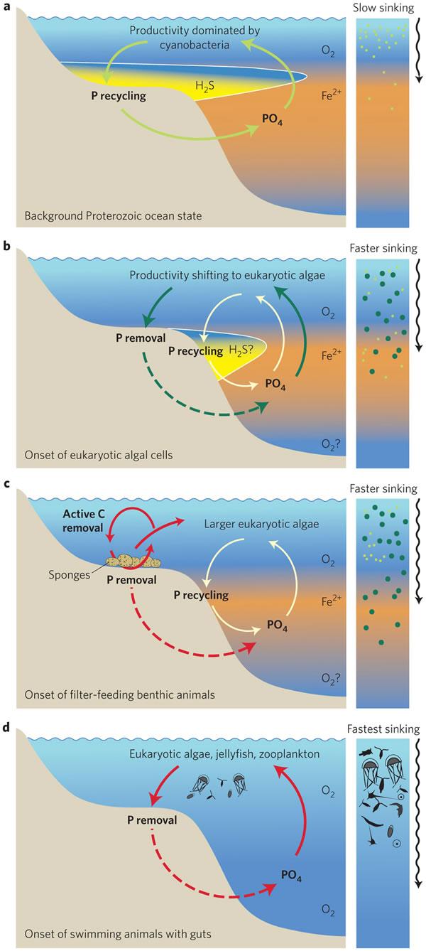 Timothy Lenton等人认为这种情况的出现是因为表层海水氧气消耗量大——而这主要取决于微型细菌的分解行为,但这些细菌几乎不会沉入海水表面以下。但是,一旦有较大细胞进化——特别是具有有机外壳的变形虫——死亡后的细胞沉入水中,海水表面的氧气需求则会下降。