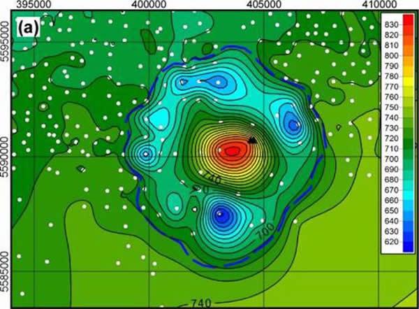 科学家通过对环形结构的分析,发现撞击坑深部受到非常严重的影响,留下了半圆形的结构,撞击坑跨度大约在8公里左右,深度在1.6至2.4公里,上面覆盖着大量的土层。可以想象,当撞击发生时这里附近生存的生物将面临巨大的灾难。来自阿尔伯塔大学的研究人员认为这种规模的撞击会杀死周围一定距离上的所有生物,从图中可以看出,环形结构的中央部分非常深,与周围的等高线形成了鲜明的对比,说明撞击时产生了强大的冲击力,即便过了数千万年也可以在地层中显现出来。