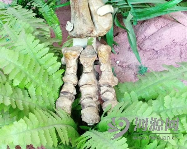 经吕君昌博士鉴定,2013年7月7日,在河源第8处恐龙化石发掘点(河源石硖恐龙蛋化石埋藏地附近),河源恐龙博物馆考古人员发现的恐龙骨骼化石,其中三块鸽子蛋大小的灰白色化石,是鸟脚类恐龙的部分脚趾化石,部位分属脚关节、脚尖和脚掌。