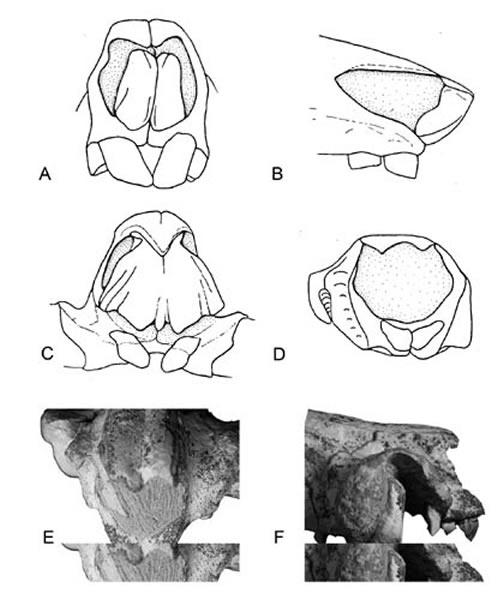 猪属 (a)、(b) , 巨林猪属 (c) 和弓颌猪属的吻部(d—f)(侯素宽供图)