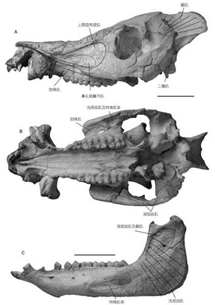 弓颌猪属的吻部肌肉和咀嚼肌(侯素宽供图)