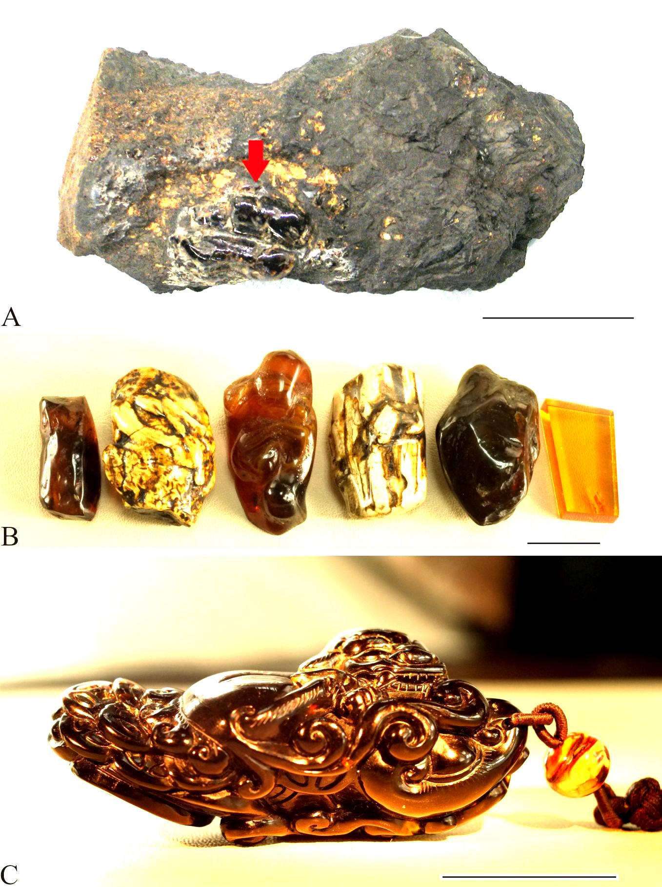 (化石网报道)据中国科学院南京地质古生物研究所:中国已发现的琥珀资源相对较为稀少。抚顺琥珀不仅是我国重要的有机宝石资源,也是我国目前已知的唯一含虫琥珀,具有极其重要的经济、文化和科研价值。抚顺琥珀形成于早始新世(约5千万年前)一个重要温室效应时期,形成过程中包裹了大量的节肢动物和微生物类群,为研究这些生物的起源和辐射提供了最直接的化石证据。抚顺琥珀的古地理位置极其关键。始新世早期亚洲大陆主体与欧洲、北美、印度次大陆之间仍有海峡隔开,抚顺琥珀保存有始新世时期亚洲大陆唯一的琥珀生物群,这为我们了解当时欧洲—亚洲—印度—北美生物分布格局提供了直接证据,进而为我们研究气候变化(例如温室效应)和构造事件(例如青藏高原隆升)对欧亚大陆生物演化的影响提供了重要线索。