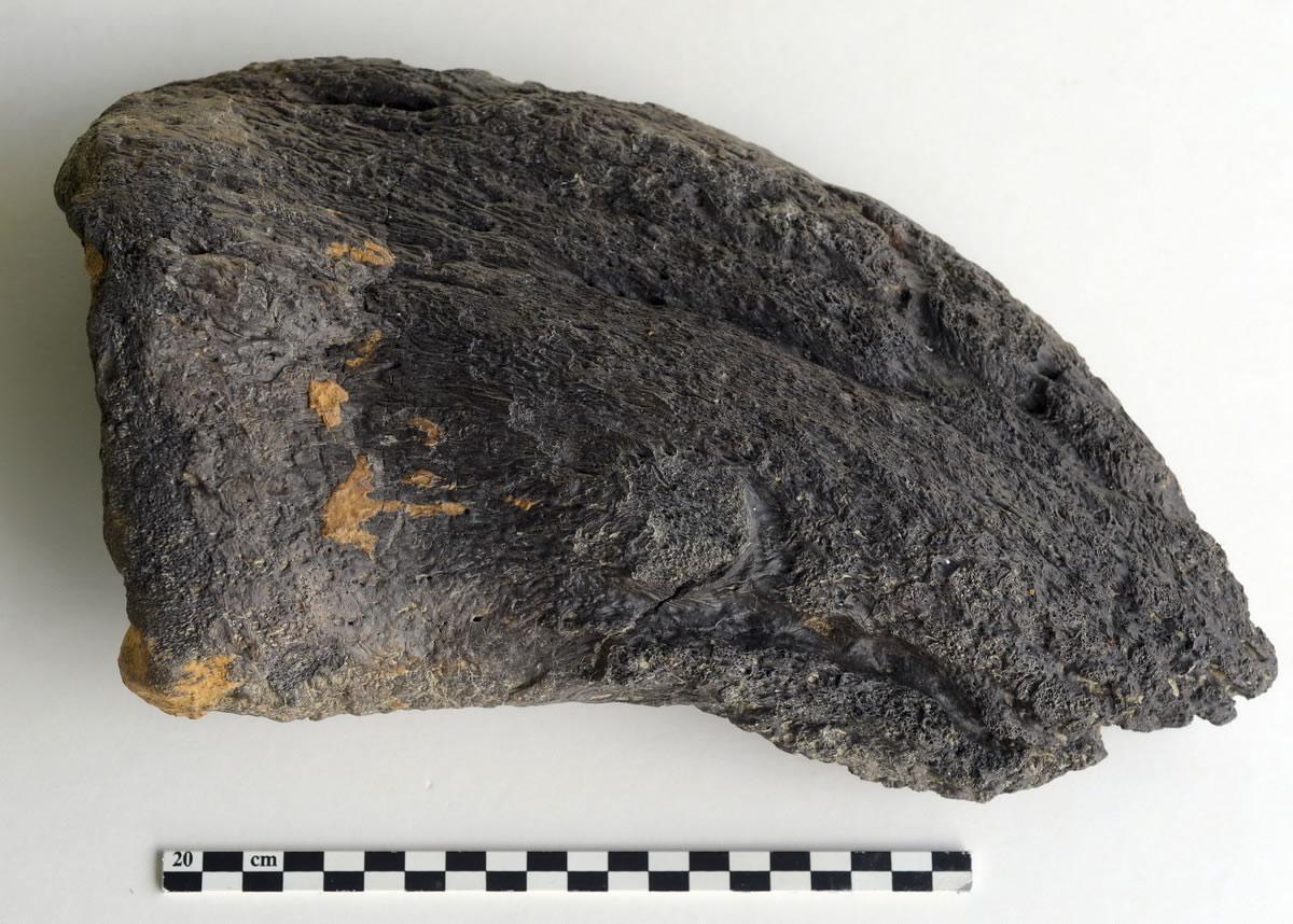 (化石网报道)据新华社/法新:7月29日在法国昂雅克-夏朗德拍摄的恐龙趾骨化石。这块34厘米长的恐龙趾骨化石可能来自一只身长超过40米的恐龙。