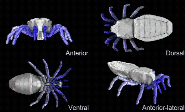 (化石网报道)据广州日报:近期,曼彻斯特和柏林的研究人员制作了一段视频,给我们展示了4.1亿年前远古蛛形纲动物是如何走路的。这种已经灭绝的蛛形纲动物曾是陆地上最早的肉食者之一,一种名叫Palaeocharinus的远古蛛形纲动物的复原图。它仅仅有几毫米长。这说明这种动物曾经在陆地上行走,大约在三四亿年前,这种生物比蜘蛛更普遍。