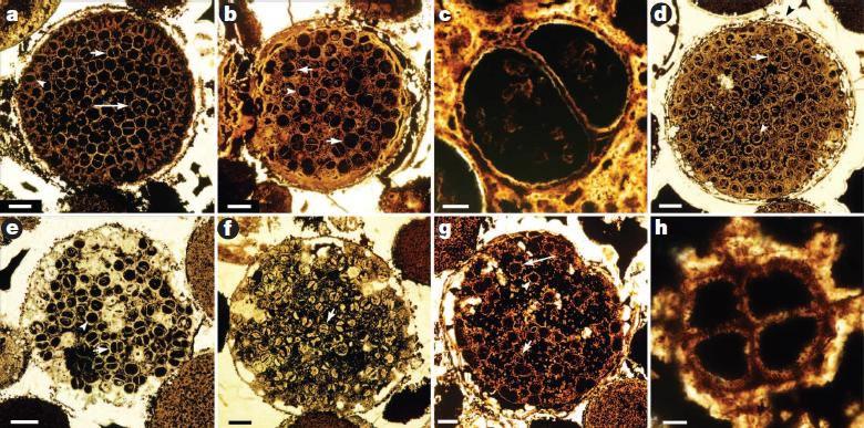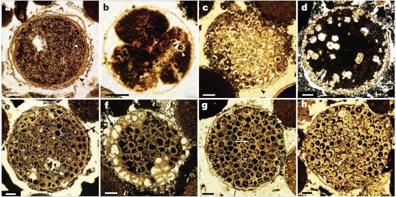 胚胎化石(Megasphaera)的早期发育阶段。(a) 单个细胞期;(b) Parapandorina期; (c–h) Megaclonophycus期。
