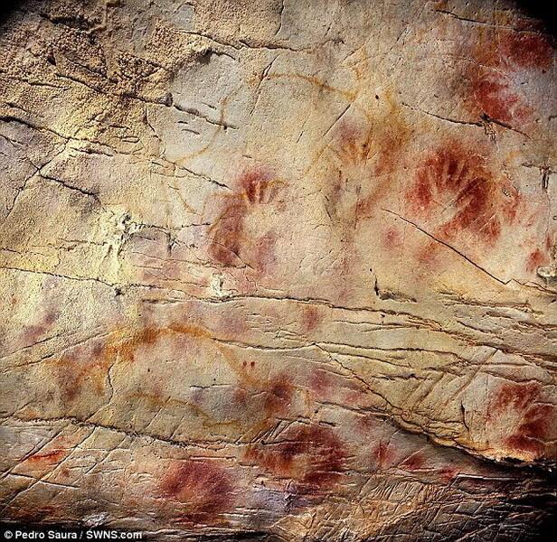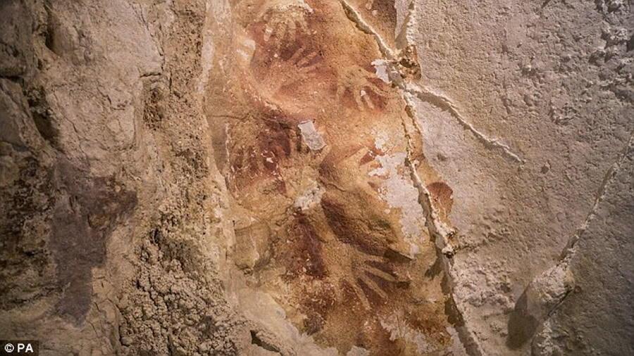 印尼苏拉威西岛西南部7个石灰岩洞中共计发现12个人类手掌印记,两个隐喻动物描绘图案,考古学家通过测量放射性同位素准确测定了这些壁画的绘制时代。