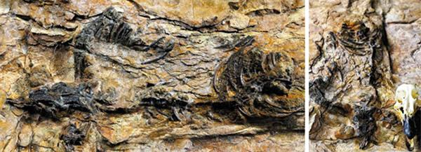 在庆尚南道河东郡发现的韩国第一块肉食恐龙骨化石。右图为此次发现的恐龙和赤颈鸭头盖骨的对比照片。(照片:国立文化遗产研究所提供)