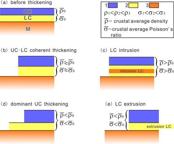 地质地球所特提斯研究中心田小波副研究员等人在此背景下对青藏高原东北缘地区开展了研究。他们利用该地区固定地震台网(图1)宽频带远震数据,提取接收函数,通过Moho面的P-to-S转换波和多次波振幅叠加扫描,获得了地震台下方地壳的厚度以及地壳平均速度比(P波与S波的速度之比,含义同泊松比)的横向变化。同时结合前人的人工源宽角反射折射地壳探测研究成果,通过地壳厚度估算了东北缘地壳的缩短率。结果显示:(1)地壳厚度与速度比的变化成反比(图1a),指示在地壳增厚过程中低速度比的地壳组成物质(如长英质岩石)在地壳中所占比例增加;(2)海拔3千米以上地区地壳厚度小于Airy均衡模型的预测(图1b),指示在地壳增厚过程中低密度的地壳组成物质(如长英质岩石)在地壳中所占比例增加;(3)沿N30°E方向,东北缘地壳缩短量为250-350公里(图1c), 远小于岩石圈板片所指示的缩短量(600-700公里),指示东北缘在缩短增厚过程中,地壳总体积在减小,可能是由于部分下地壳随地幔岩石圈向南俯冲,没有参与地壳的缩短增厚。以上研究表明:青藏高原东北缘的地壳增厚主要来自于上地壳的贡献(图2),如上地壳的纯剪切增厚或上地壳北向仰冲的简单剪切叠置增厚,而下地壳的底部与地幔岩石圈并未明显缩短。