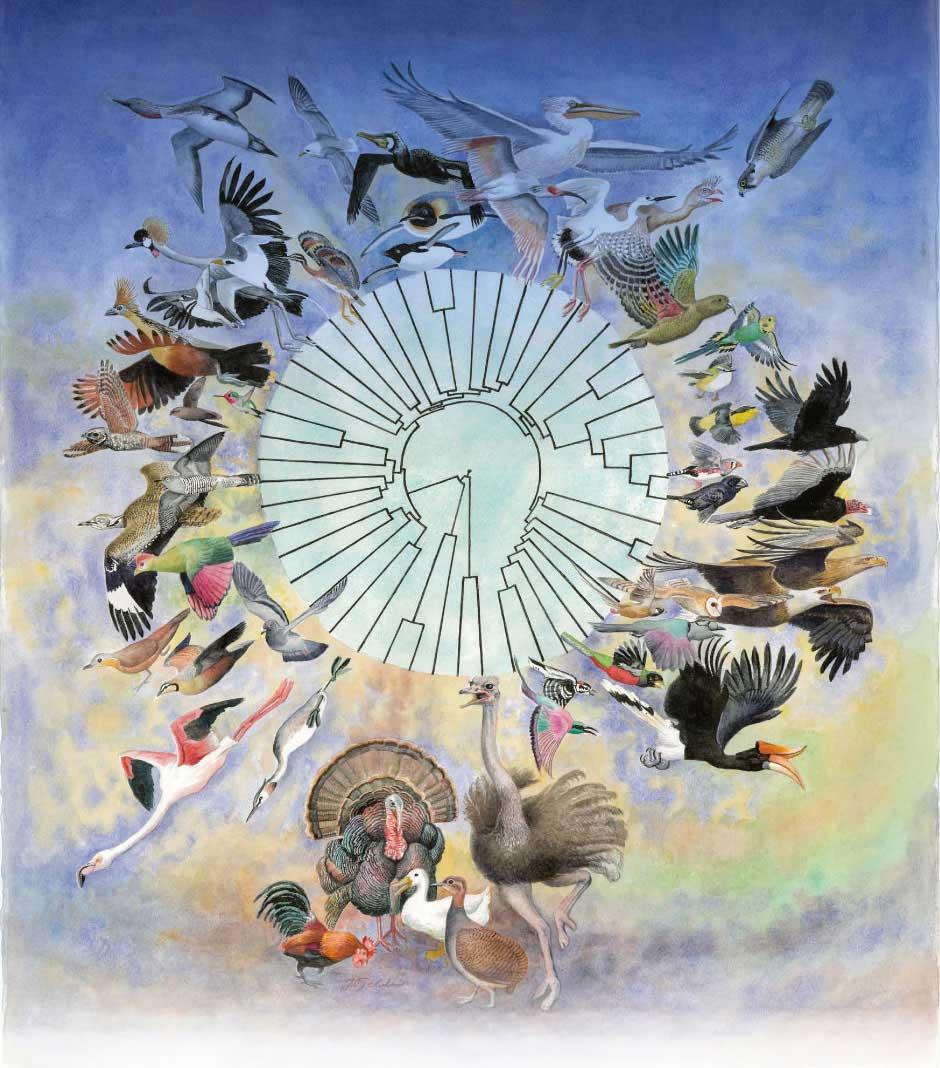这项研究耗费了四年时间,许多研究人员对40多个鸟类物种进行了基因测序,以此梳理不同种类间的异同点。科学家们发现,今天的所有鸟类都能够追溯到一种从6500万年前大灭绝中幸存下来的有羽恐龙,它们快速进化成为一种拥有两条腿和有羽翅膀的产蛋动物。