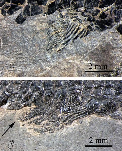 精美乌沙鱼的雌雄和雄性臀鳍对比, 箭头指示雄性臀鳍上的钩子(徐光辉供图)