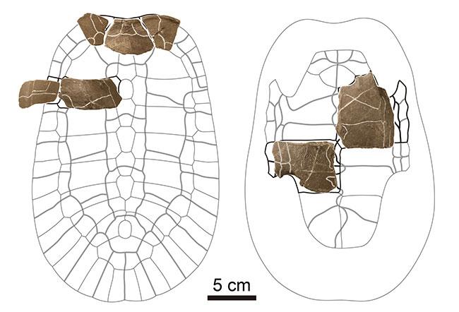 1.2亿年前阿杜库斯龟属新种“千石峡阿杜库斯龟”化石复原。背侧壳(左)和腹侧(右图)。(图片:日本福井县立恐龙博物馆)(化石网配图)