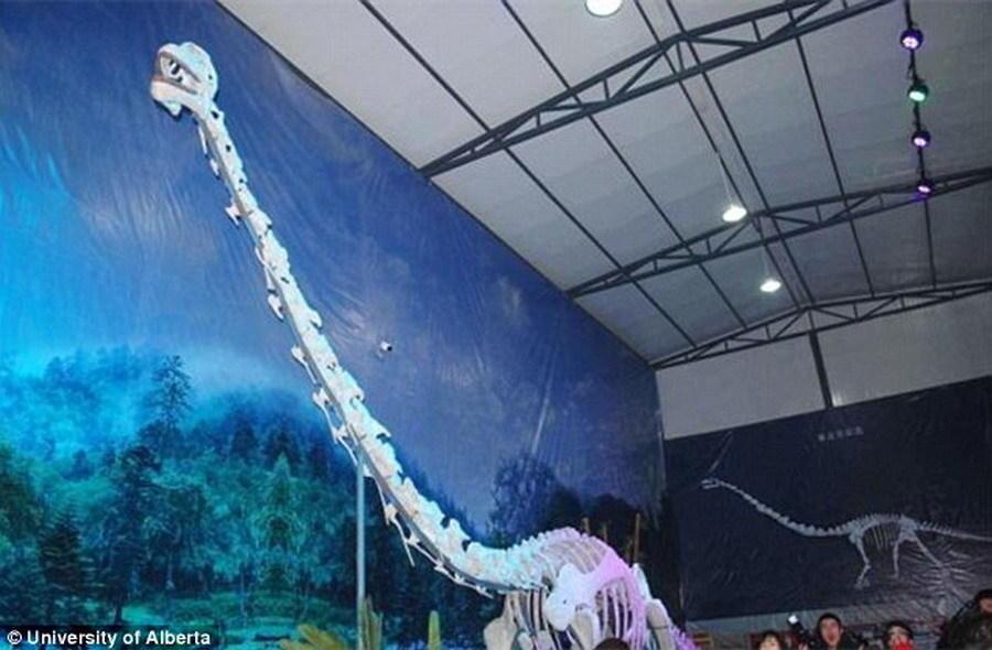 如图所示,这是綦江博物馆陈列的綦江龙骨骼模型,大量参观者前来观看。