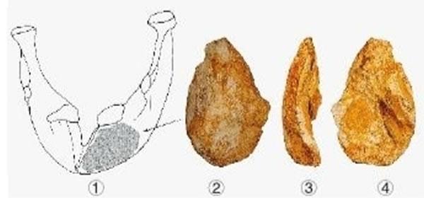 骨制手斧,由图①剑齿象下颌骨示意图中阴影部位制成;图④中可见长约6厘米的凹陷空间,能轻松将大拇指放入,方便拿握手斧。