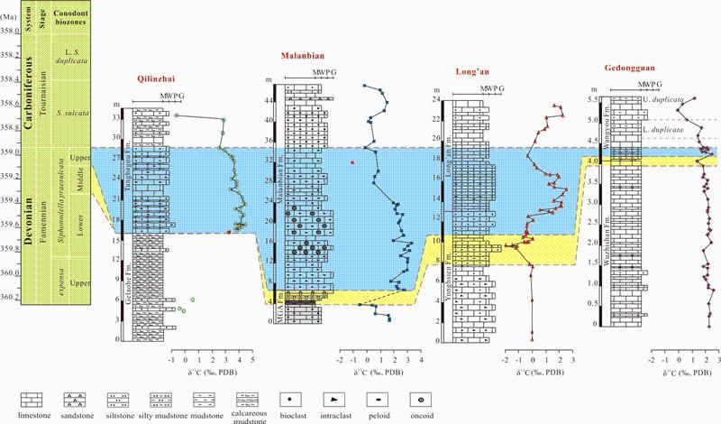 为深入研究这一关键转折期海洋中环境变化和碳循环过程,南京古生物所郄文昆博士等对我国华南地区不同沉积相区的四条泥盆-石炭系界线剖面(贵州独山其林寨、湖南新邵马栏边、贵州长顺格董关和广西南宁隆安)的生物地层、沉积记录和碳同位素记录进行了综合研究,结果表明在泥盆纪末期中Siphonodella praesulcata带,即Hangenberg生物灭绝事件层位,全球范围内发生了一次明显的海退,并伴随着碳同位素值的一次负向偏移事件;泥盆纪末期上Siphonodella praesulcata带,伴随着海平面的上升和气温的升高,碳同位素值表现出一次明显正向偏移事件(HICE);然而,不同沉积相区的碳同位素值峰值和偏移幅度明显不同,反映出局部碳循环(如陆源有机质、营养元素输入、有机质的重新矿化)对研究区内溶解无机碳(DIC)的碳同位素组成的分布起重要的控制作用。