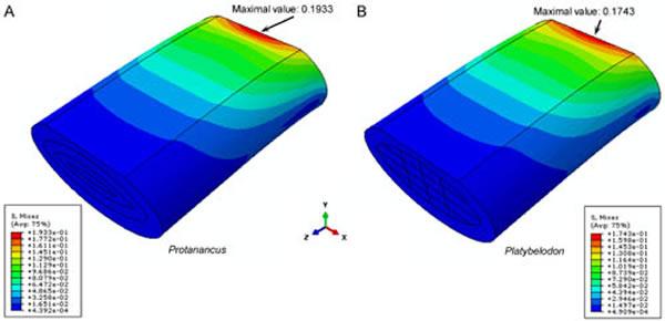 原互棱齿象(A)和铲齿象(B)下门齿的有限元力学模型 (王世骐供图)