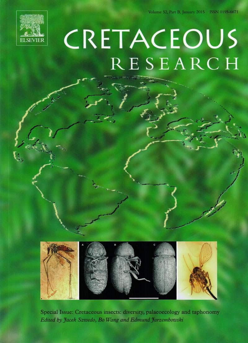最近,南京古生物所王博副研究员、外国专家特聘研究员E.Jarzembowski博士和波兰J. Szwedo博士一同应邀担任了国际地学期刊《白垩纪研究》(Cretaceous Research)的客座编辑,共同组织了“白垩纪昆虫:多样性、古生态和埋藏学”专集。该专集包括来自9个国家作者的共36篇文章,涵盖了白垩纪主要的12个昆虫化石群。专集共描述昆虫化石12目,并建立2新科27新属60新种,集中展现了白垩纪昆虫的最新研究进展。