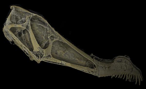 (化石网/歆塬 编译)通常情况下我们都只能见到恐龙等爬行动物骨骼化石的外部形态,那么它们的内部是什么样子的呢?来自大英自然历史博物馆的专家利用CT技术对翼龙的脑部化石进行扫描,解开了有关它们的更多谜团。这块头骨化石属于生活于早白垩世的古魔翼龙(Anhanguera),它们以鱼类为食,具长长的鼻部,翅展可宽在4~5米,化石发现于巴西,约有0.5米长,是展览于英国的唯一一块古魔翼龙化石。为了得到良好的研究状态,化石泡在稀释醋酸中长达两年,以除去周围的灰岩,这种处理方式非常具有前瞻性,因为那个时候甚至博物馆的专家们都还没有接触过CT技术。