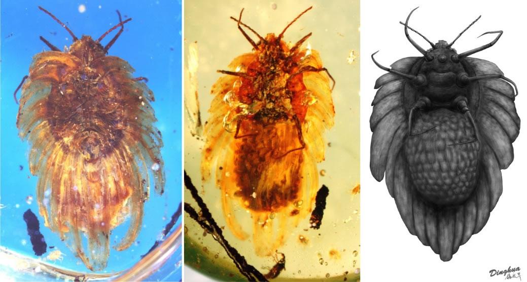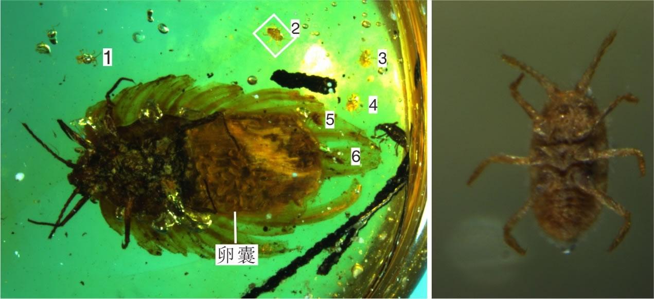该枚琥珀保存一个雌性成虫,其尾部带有膨大的卵囊,卵囊中保存有约60枚已孵化卵壳和未孵化的卵。此外,在卵囊下部和身体外侧保存有6个新孵化出的一龄幼虫。介壳虫雌性成虫一般生活在各种植物上,其背部则由分泌的蜡片盖住,以保护自己和后代。该介壳虫属于旌蚧科的冠类群,许多现生旌蚧科类群也具有相似的育幼结构和行为。有意思的是一些关系较远的介壳虫类群也具有类似的行为。本研究表明介壳虫育幼行为至少起源于1亿年前,表现出长期的停滞演化,进一步的系统学调查发现育幼行为可能在介壳虫祖先类群就已经出现。此行为极大地提高了该类昆虫的繁衍成功率,可能是介壳虫早期辐射演化的一个重要因素。