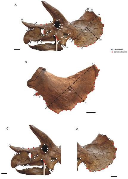 Leonardo Maiorino等人通过标志性的几何形态测量检查了海氏双角龙(Nedoceratops hatcheri)、三角龙属不确定种(Triceratops spp.)和牛角龙属不确定种(Torosaurus spp.)的28个头骨的侧面观形态和36个鳞骨,比较这些分类单元之间的个体发育轨迹。主成分分析和聚类分析,确定不同的头骨形态。