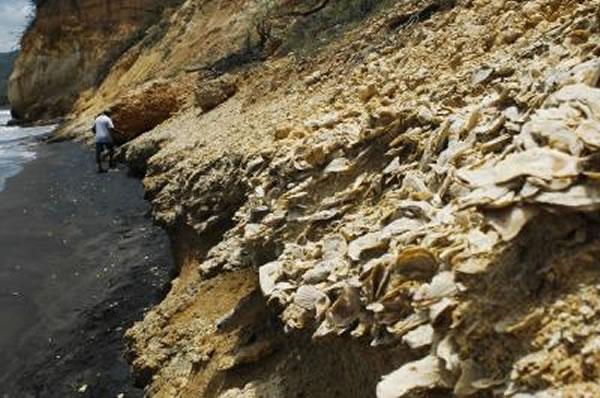 位于牙买加的、暴露在外面的上新世的沉积物中含有海洋生物化石。Finnegan 和海洋生物灭绝风险这一研究的共同作者们对全球的化石地理位置数据进行了分析。(Aaron O'Dea)
