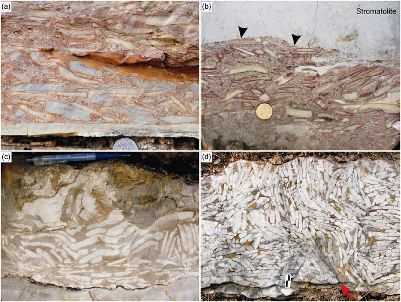 图1. 华北台地寒武系发育的典型的竹叶状灰岩。(a)-(b):具叠瓦状构造的竹叶状灰岩,表明由水流改造沉积而成;(c)-(d):呈杂乱状排列的竹叶状灰岩,可能是由软沉积物变形而成。